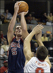 POR EL HONOR: Raef LaFrentze de Estados Unidos fue imparable para la defensa de España. (AP)