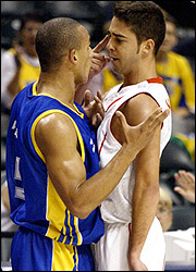 CARA A CARA: Juan Carlos Navarro de España (derecha) y Alex Garcia de Brasil, discuten durante el partido que ambos equipos jugaron el viernes. (Reuters)