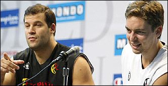 MUY RELAJADOS: Los Españoles Alfonso Reyes, izquierda y Pau Gasol, bromean durante una conferencia de prensa el miércoles en Indianapolis. (AP)