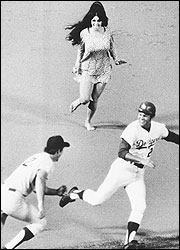 Morganna Roberts, la 'Bandida de los Besos', corre tras los jugadores Wes Parker de los Dodgers de Los Angeles y Doug Rader (2) de los Piratas en 1970. (AP)