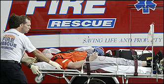 El momento en que los paramédicos retiran a Steve Bechler del campo de prácticas de los Orioles en Fort Lauderdale. (REUTERS)