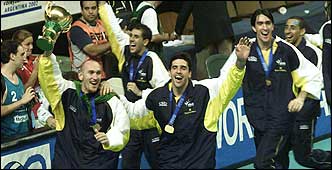 El estadio Luna Park de Buenos Aires se tiñó de amarillo y verde tras el título mundial conseguido por Brasi, que venció 3-2 a Rusia en la final. El capitán Nalbert, con la Copa, encabeza la vuelta olímpica
