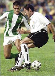 Ballesta controla el balón ante "Juanito", en la victoria 2-1 del Valencia con el Betis por la segunda semifinal del Trofeo Ramón Carranza