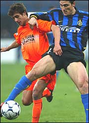 Pablo Aimar (Valencia) y Javier Zanetti (Inter) se olvidan que son compañeros en el equipo nacional argentino (Reuters)