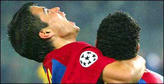 Michael Reiziger alza a Javier Saviola, tras darle el pase-gol que le sirvió al Barcelona para lograr el empate ante Juventus en Turín