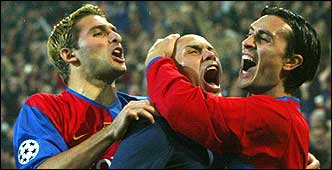 Otra vez los argentinos festejando en Basilea. Hakan Yakin y Julio Rossi abrazan a Christian Gimenez autor del gol contra Manchester United (Reuters)