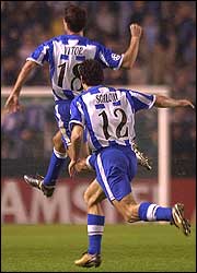 Lionel Scaloni acompaña a Victor Sánchez, autor del gol del Deportivo La Coruña contra el Bayern Munich(AP)