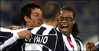 Di Vaio y Davids festejan con Camoranesi autor de las dos asistencias en los goles de la Juventus contra el Feyenoord (Reuters)